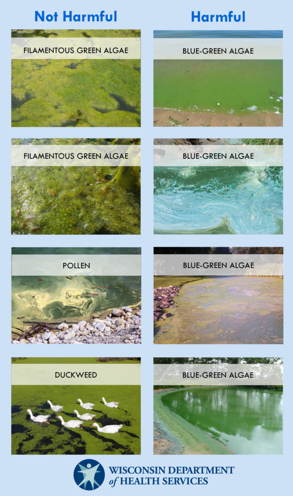 Certain varieties of blue-green algae blooms can produce toxins that are linked to illness in humans and animals. Avoid swimming or wading in water that appears to have a blue-green algae bloom. If you do come in contact with algae-laden water, wash with fresh water afterwards.