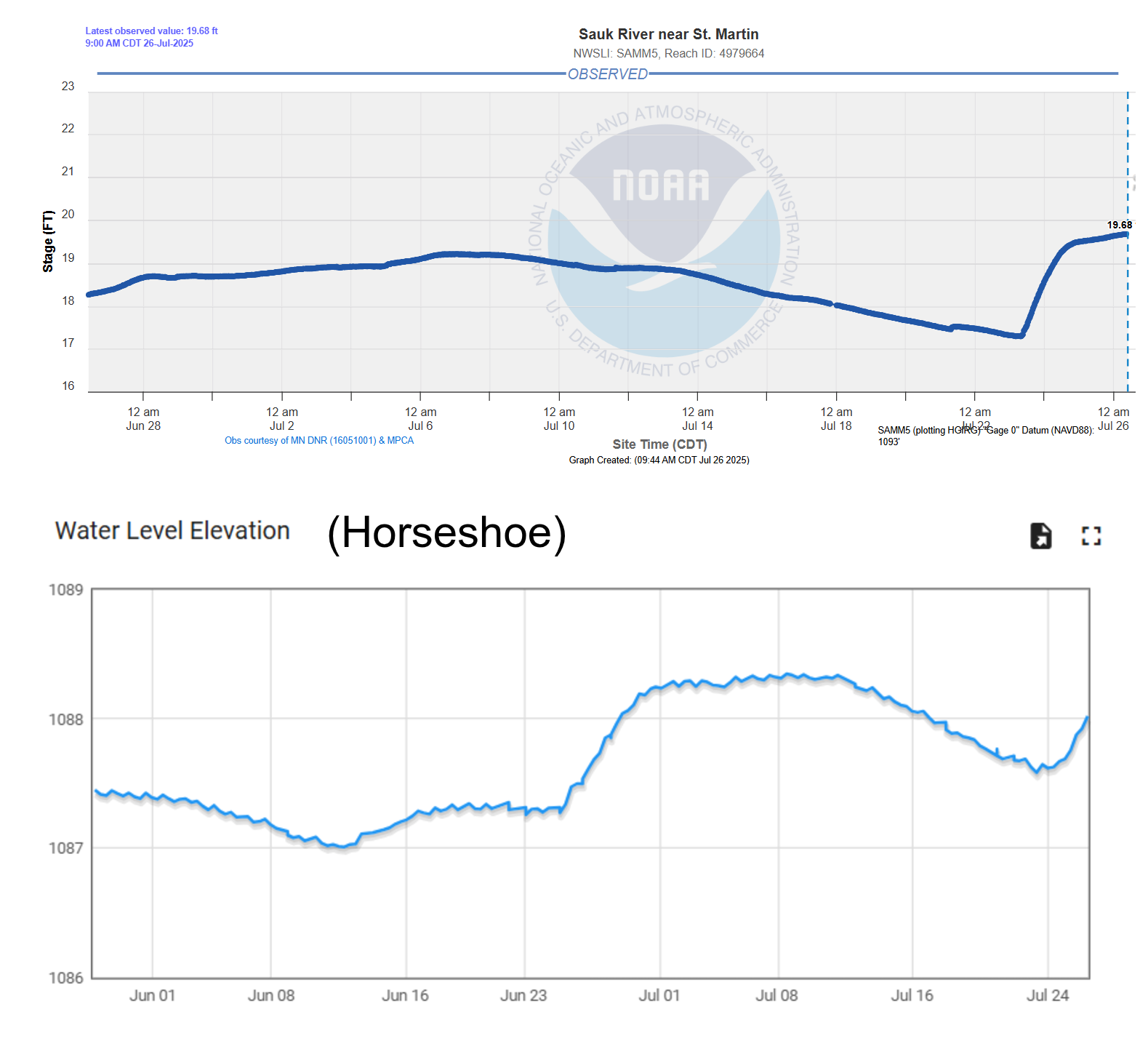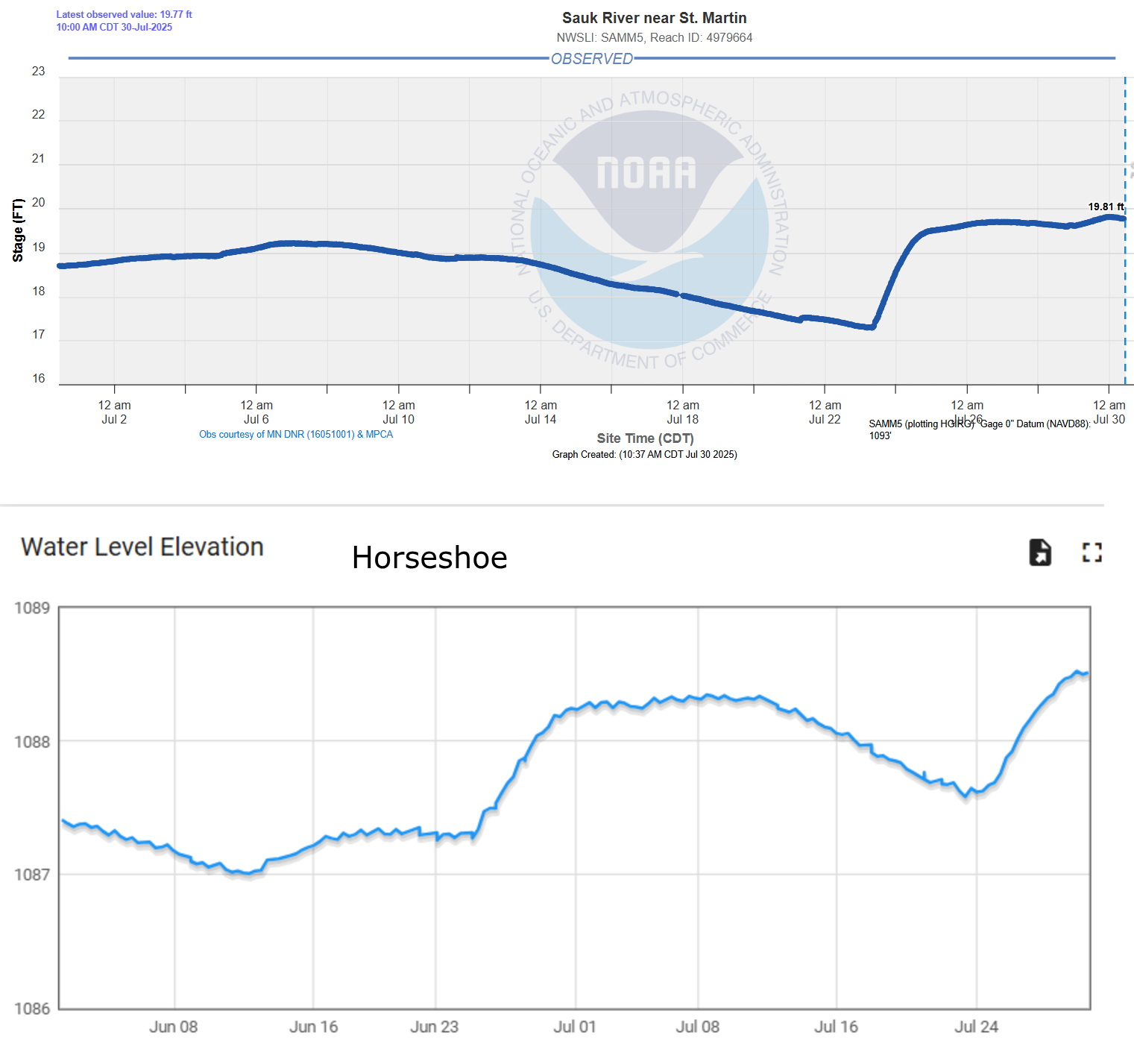The Stearns County Sheriff's Office has confirmed a decision to leave in place for now the 300-foot no wake restriction for a number of area lakes, including the entire Chain. As you can see from the two graphs, the water level in St. Martin (approximately five miles upstream from Becker Lake) is almost a half-foot higher than it was at the peak in early July that prompted the temporary restriction in the first place. And the gauge at Horseshoe Lake has come up ~5 inches in the past few days.